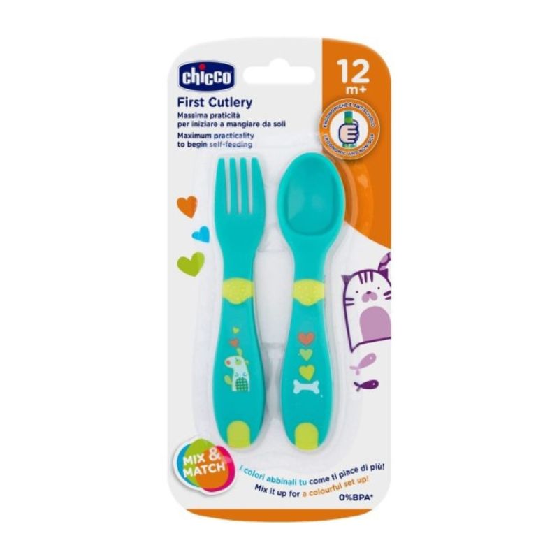 Le set Chicco Mes Premiers Couverts 12 Mois et + comprend une cuillère et une fourchette en plastique, spécialement conçues pour les tout-petits.