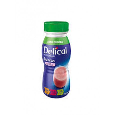 La boisson HP/HC sans sucres saveur fraise Delical est un complément nutritionnel élaboré à des fins médicales spéciales. Cette boisson hyperprotéinée et hypercalorique sans sucres est recommandée pour les personnes souffrant de dénutrition et pour les personnes diabétiques.La dénutrition, qui touche une personne gée sur 10 à domicile et 1 sur 2 à l’hôpital, correspond à un état pathologique où les apports nutritionnels sont insuffisants en rapport avec les dépenses énergétiques de l’organisme.Les personnes diabétiques sont soumises à une surveillance stricte afin de restreindre les apports en sucre.Cette boisson est prête à l’emploi et sera plus appréciée servie fraîche. Elle correspond à un apport nutritionnel en protéines et en fibres afin de combler les carences. Les fibres vont réguler le transit intestinal. Les protéines jouent un rôle essentiel dans le renouvellement des tissus musculaires, de la peau et de la matrice osseuse.Une boisson HP/HC sans sucres saveur fraise apporte 300 kcal, 20 g de protéines et 7 g de fibres et sera appréciée éloignée des repas.Cette boisson saveur fraise apportera une touche fruitée et elle se décline sous différents parfums afin de plaire à tous.Caractéristiques :Sans sucreSans lactoseSans glutenStérilisée UHTAliment diététique destiné à des fins médicales spécialesFabriqué en FranceConseils d’utilisation:1 à 2 bouteilles par jour en complément de l’alimentation ou à adapter à l’avis médical. A consommer de préférence à distance des repas. Bien agiter avant d’ouvrir. Boire frais de préférence.Conservation :A température ambiante dans un endroit frais et sec. Après ouverture, conserver au réfrigérateur 24 H maximum.Compositions:Eau, maltodextrines, protéines de lait, huile végétale (colza), fibres (amidon de maïs), arômes, minéraux (citrate de sodium, citrate potassium, chlorure de potassium, carbonate de calcium, carbonate de magnésium, citrate de magnésium, pyrophosphate ferrique, sulfate de zinc, sélénite de sodium, sulfate de manganèse, sulfate de cuivre, fluorure de sodium, chlorure de chrome, iodate de potassium, molybdate de sodium), vitamines (C, A, E, B5, PP, D3, B2, K1, B6, B1, B12, B9, H), émulsifiant (lécithine de tournesol), colorants ( E120, béta carotène), édulcorants (acésulfame K, sucralose), antioxydant (alpha tocophérol)