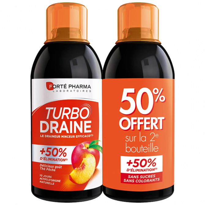 FORTE PHARMA TurboDraine est une délicieuse boisson minceur drainante,à boire tout au long de la journée. 3 actions minceurs : Brûle et élimine les graisses tout en remodelant la silhouette, draine et purifie l’organisme et réminéralise l’organisme.Conseils d’utilisationVersez 10ml dans un grand verre d’eau. Dégustez la boisson tout au long de la journée. Cure de 10 jours, à renouveler si besoin pour continuer à remodeler sa ligne. Prendre en cure de 3 semaines à chaque changement de saison.Précautions d’emploi : Déconseillé aux femmes enceintes ou qui allaitent et aux enfants de moins de 8 ans sans avis médical.