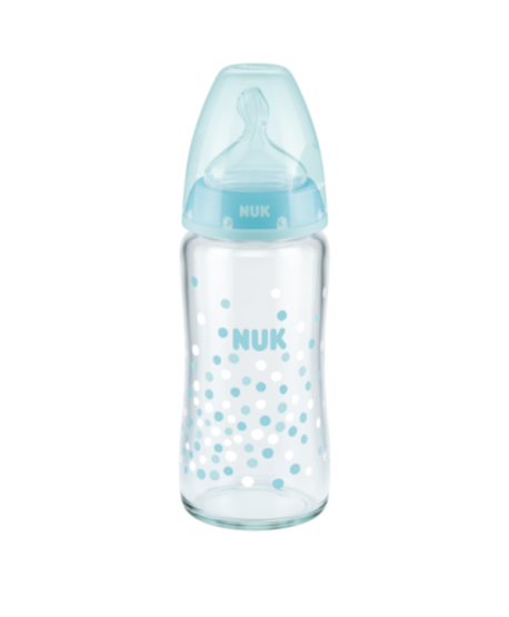 Biberon verre tétine silicone 240ml nuk first choiceCompatible avec l’ensemble des accessoires nuk first choice.Muni d’une tétine physiologique Air System en silicone taille 1 (0-6 mois), perçage M (lait infantile) à base élargie pour que la bouche de bébé se positionne naturellement en butée comme au sein. La valve Air System réduit les risques de coliques et de hoquets.-Large ouverture, pour une préparation et un nettoyage facilités.-Silhouette ergonomique pour une meilleure prise en main, base élargie assurant une bonne stabilité, bague à vis bi-matière munie de picots pour une meilleure préhension et une fermeture optimisée.-Pastille emboîtable dans la bague à vis, permettant une fermeture hermétique lors du mélange du biberon, sans risque de fuite pendant les transports.Conseils d’utilisationLes principales recommandations :Ne pas dépasser un délai d’une heure lorsque le biberon est sorti du réfrigérateur pour sa consommation.Ne pas dépasser un délai de 30 minutes dès lors que le biberon a été réchauffé.Ne pas utiliser de l’eau ayant subi une filtration ou un adoucissement.Ne pas utiliser de l’eau embouteillée provenant d’une bouteille ouverte depuis plus de 24 heures.Ne pas réchauffer le biberon en le laissant à température ambiante, en raison du risque de développement microbien. Utiliser soit le chauffe-biberon, soit le bain-marie.Effectuer la préparation du biberon dans un endroit propre, sur un plan de travail préalablement nettoyé.Il est possible d’utiliser l’eau du robinet si :après ouverture du robinet, un temps d’écoulement (quelques secondes) de l’eau est respecté avant de la recueillir,seule l’eau froide est exclusivement utilisée (attention à la position du mitigeur),le robinet fait l’objet d’un entretien régulier (nettoyage, détartrage),La boîte de lait doit être soigneusement refermée après chaque usage.Il est essentiel d’agiter le biberon pour homogénéiser la température du lait et de vérifier cette dernière en mettant quelques gouttes sur la face interne de l’avant-bras de la personne qui alimente l’enfant avant de proposer le biberon à l’enfant.Après utilisation, vider le biberon, rincer au robinet à l‘eau froide et laver en lave-vaisselle. En l’absence de lave-vaisselle, immerger le biberon et les annexes dans de l’eau chaude additionnée de liquide-vaisselle, nettoyer avec un goupillon, et rincer.La conservation du biberon doit se faire dans un réfrigérateur propre, qui doit être lavé au moins une fois par mois avec de l’eau savonneuse, rincé à l’eau puis à l’eau javellisée.CompositionUn biberon et une tétine en silicone.Sans bisphénol A.