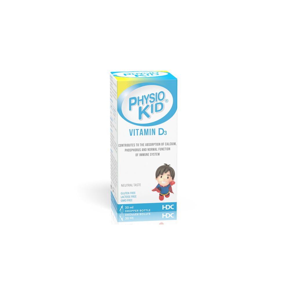 PHYSIOKID Vitamine D3 Gouttes est un complément alimentaire destiné aux nourrissons, enfants et adultes, pour prévenir les carences en vitamine D et soutenir le bon développement des os, dents et muscles.