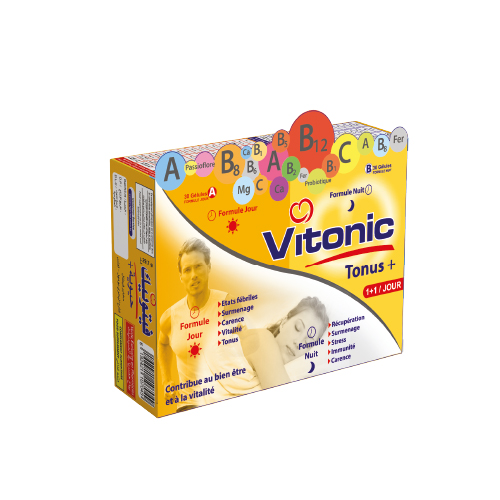VITONIC TONUS + est un complément alimentaire qui est conseillé pour surmonter les Période de Stress et de Surmenage et pallier aux Carences. Ce produit des laboratoires vital a une formule spécifique Nuit qui contient du Magnésium pour la récupération et une formule Jour qui contient du Calcium qui contribue au Bien-être et à la Vitalité.